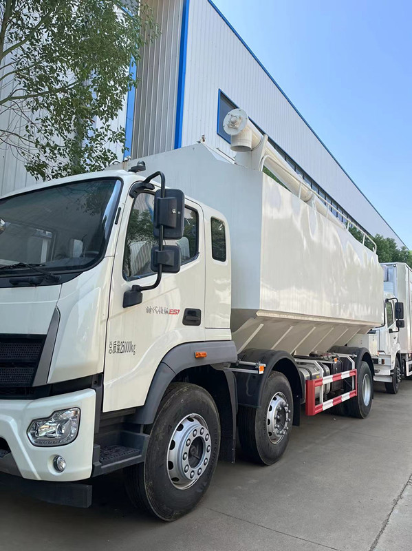 散裝飼料運(yùn)輸車,散裝飼料車的飼料罐架設(shè)在卡車的底盤上,罐頂開有進(jìn)料口.頂部的一根螺旋輸送卸料管(俗稱卸料絞龍)則可自由回轉(zhuǎn)和抬升,抬升的仰角可達(dá)60度。運(yùn)輸時(shí),頂部的螺旋管平臥在罐頂;卸料時(shí)則抬起,使管端的出料口與畜禽飼養(yǎng)場(chǎng)貯料罐頂部的進(jìn)料門相接,駕駛室內(nèi)裝有操縱裝置(操縱裝置也可裝置在罐體尾部),卸料時(shí)通過(guò)車底的動(dòng)力輸出軸和減速器來(lái)驅(qū)動(dòng)螺旋,以完成卸料。