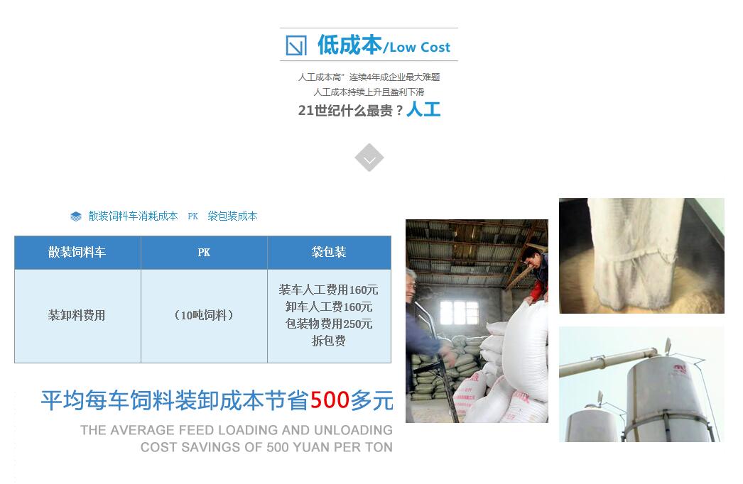1 經(jīng)濟(jì)效益、勞動(dòng)時(shí)間等對(duì)比 項(xiàng)目 袋包裝 飼料罐 裝卸費(fèi)用(1噸飼料) 18元(人工) 2元(電耗) 包裝袋費(fèi)用(1噸飼料) 20元 0元 裝車時(shí)間(10噸飼料) 60分鐘 20分鐘 卸車時(shí)間(10噸飼料) 60分鐘 30分鐘 從上表中可以直觀的看出:1.在裝卸費(fèi)用上,散裝運(yùn)輸比袋包裝運(yùn)輸要節(jié)約16元/噸。2.在包裝費(fèi)用上,散裝運(yùn)輸比袋包裝運(yùn)輸要節(jié)約20元/噸。3.在裝卸時(shí)間上,散裝運(yùn)輸比袋包裝運(yùn)輸要節(jié)約70分鐘。通過(guò)以上統(tǒng)計(jì)分析發(fā)現(xiàn),散裝飼料運(yùn)輸車經(jīng)濟(jì)效益非常明顯。